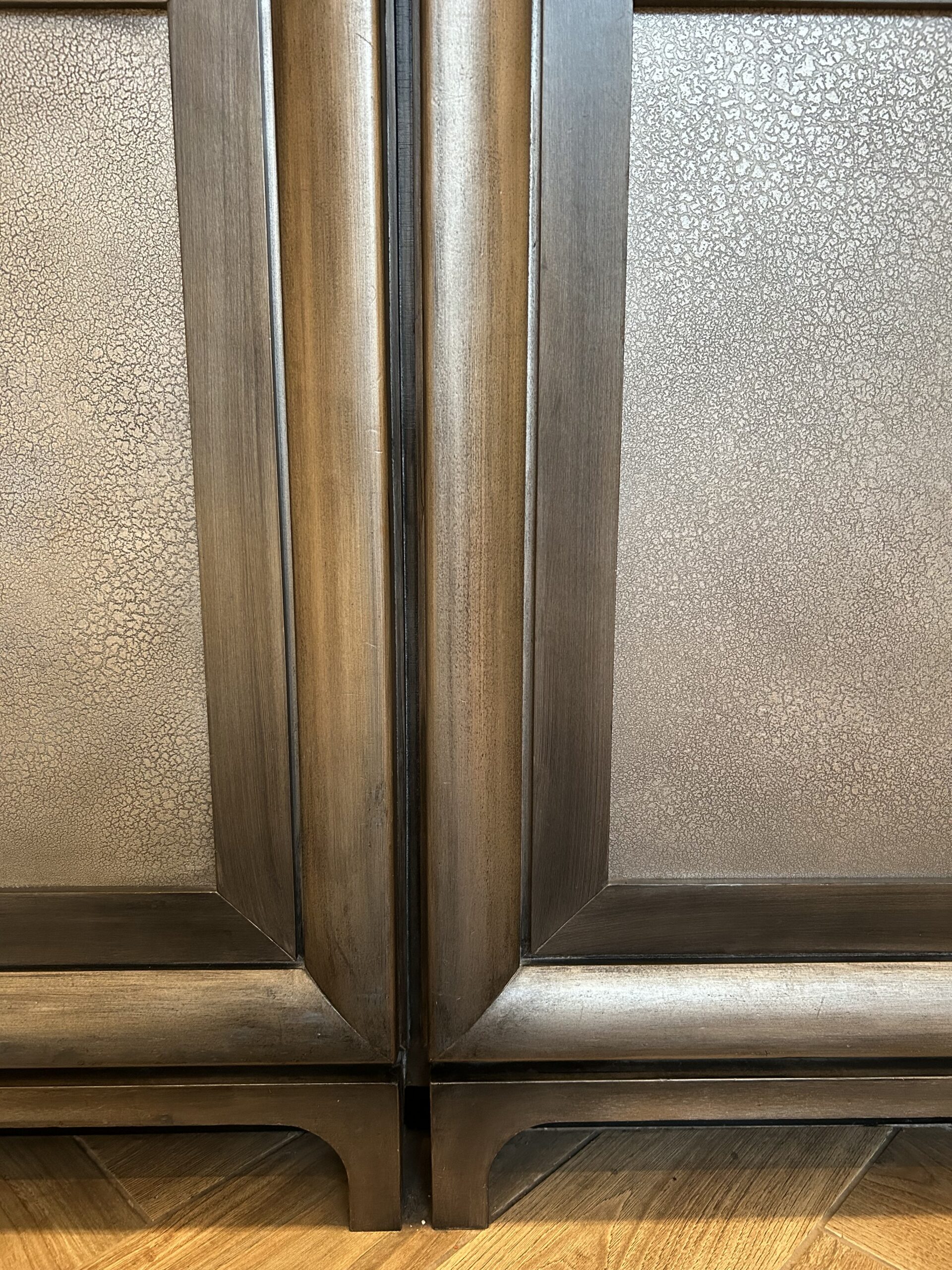 The desk itself is a beautiful piece. Dark-stained wood framing with textured decorative panels, clean lines, a design that fits the property’s upscale Buckhead location. But the lower portions were taking a beating. The base molding had multiple spots where the finish had chipped down to bare wood. The vertical center stiles where the two desk sections meet had visible peeling and scratches. It’s the kind of wear that happens gradually — you don’t notice it until one day you really look, and it’s everywhere.